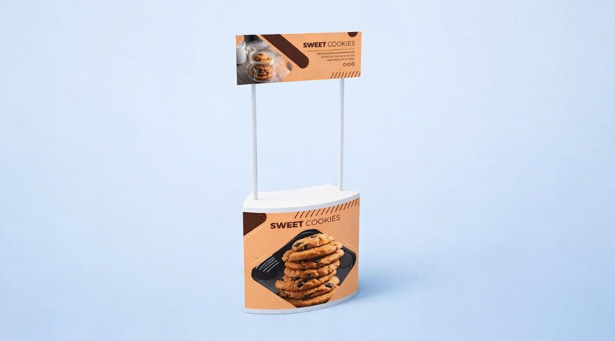 - Banchetto promozionale Counta: è il desk dei promoter. Offre uno spazio sufficiente per esporre prodotti, materiale promozionale o dispositivi elettronici come tablet o monitor. Costruito con materiali resistenti, il banchetto è progettato per durare nel tempo e supportare un uso frequente. La superficie del banchetto e il suo crowner possono essere completamente decorati con stampe ad alta definizione, garantendo un impatto visivo unico.