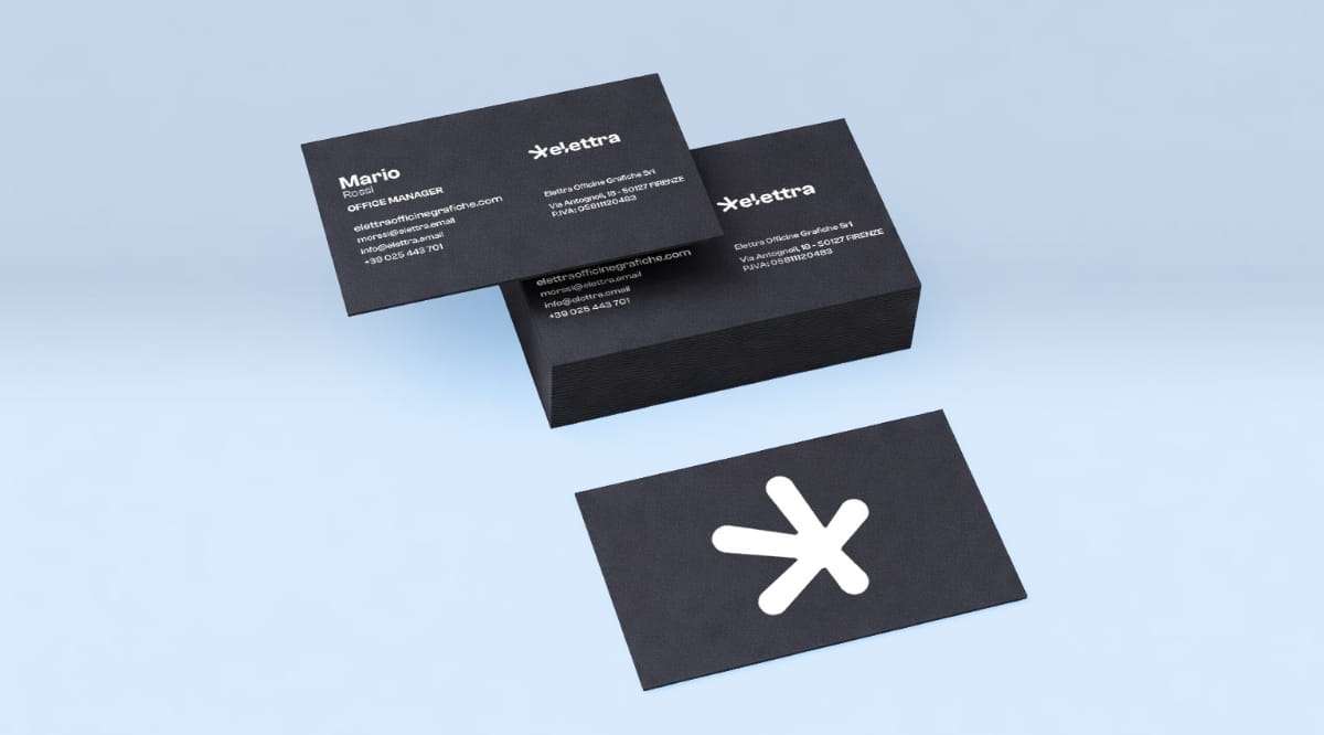 Realizza biglietti da visita eleganti con Elettra Officine Grafiche. Personalizza i tuoi biglietti da visita direttamente online, su cartoncino nero e stampa bianca. Questa combinazione può creare un effetto di pregio e di classe che lascerà un'impressione duratura sui destinatari.
